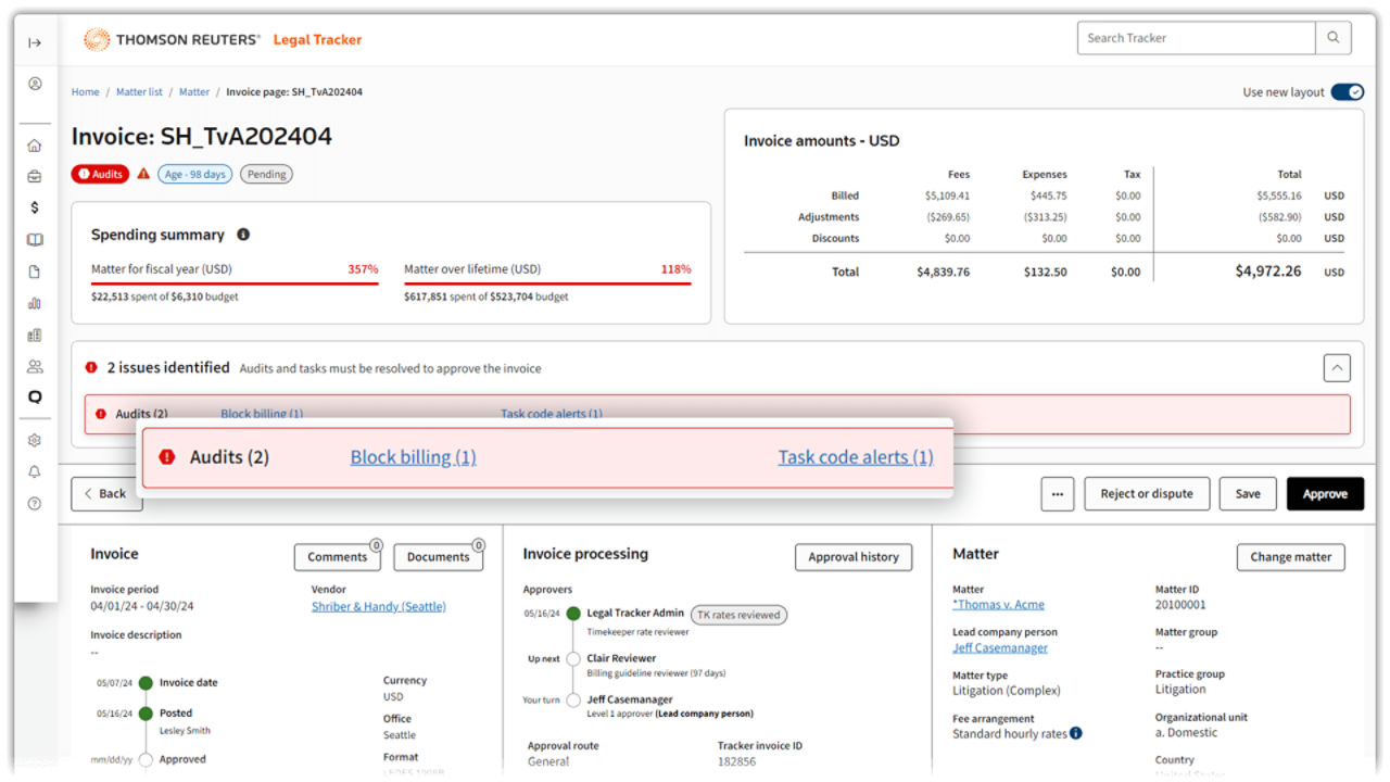 - Automated invoice review: Audit invoices from external counsel through a Thomson Reuters patented invoice hold workflow - the only solution that ensures invoices are processed only after required matter budgets, status, and matter updates are completed.