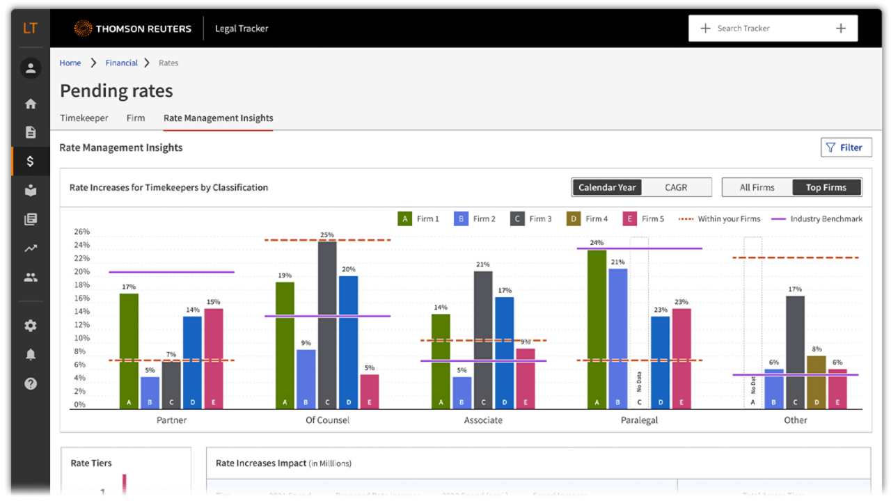 - Benchmark and analyse: Use enhanced tools to benchmark legal spend against industry, historical, and activity data, and quickly analyse rate increases by timekeeper and firm.